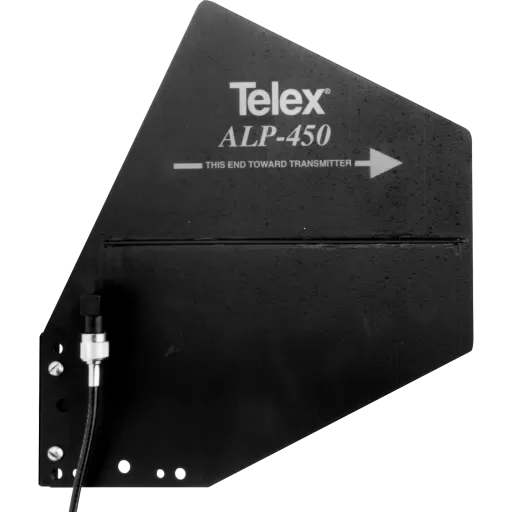 This directional log periodic antenna covers 450-900 MHz. Unique forward coverage pattern increases signal gain up to 5dB. Supplied with mounting hardware for wall or mic stand, and 10' of low loss coaxial cable. Measures 9.5" L x 11" H, painted matte black.