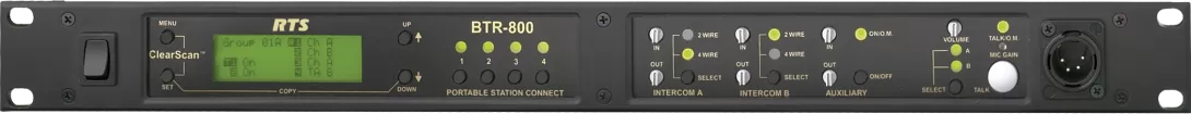 The BTR-800 system offers reliable, high-performance full-duplex communications, supporting up to four TR-800 or TR-825 beltpacks. It operates within 470 to 740 MHz with a 1,000-foot range, extendable with RadioCom antenna systems.