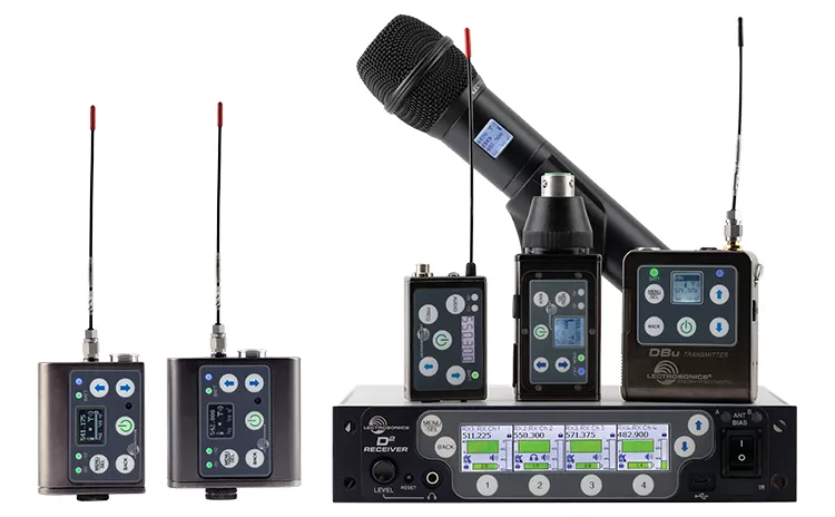 The D Squared digital wireless microphone platform utilizes the Lectrosonics 4th-generation digital architecture for excellent flexibility, ultra-fast setup, studio quality audio, and ultra-low latency. The system includes the DSQD, DSR4, DSR, DCR822, M2Ra, and DCHR digital receivers, DSSM digital miniature water-resistant transmitter, DBu, DBSM, and DBSMD digital belt pack transmitters, DPR-A digital plug-on transmitter, and the DHu digital handheld transmitter. System features include 24 bit, 48 kHz digital audio, 2-way IR sync, four different encryption key policies, and a tuning range from 470-608 MHz (470-614 MHz for export versions).
