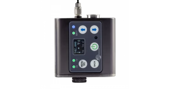 A water resistant control panel with OLED, membrane switches and multi-color LEDs make input gain adjustments, frequency and compatibility mode selection quick and accurate. The battery compartment accepts industry-accepted AA batteries (lithium recommended).