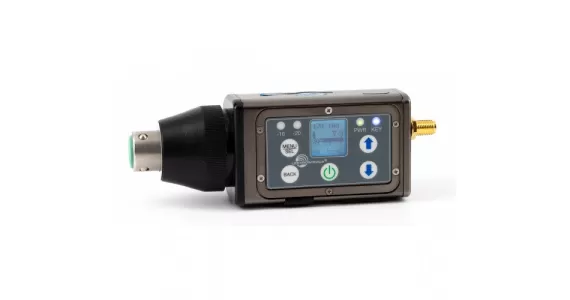 The transmitter is specially designed with high efficiency digital circuitry for extended operating time on two AA batteries, with status indicated by a multi-color LED. An IR (infrared) port is included to simplify setup with IR enabled receivers. Updates can be made via SD card.