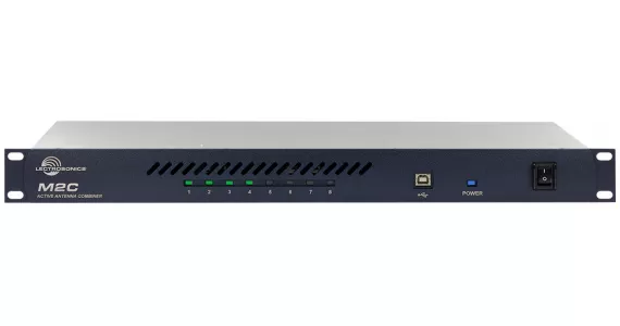 The M2C active antenna combiner is designed as an ideal matching component to Lectrosonics digital transmitters. Up to eight transmitters can feed a single antenna to minimize cabling in multi-channel systems. The inputs are isolated to minimize crosstalk and IM (intermodulation) between RF channels.
