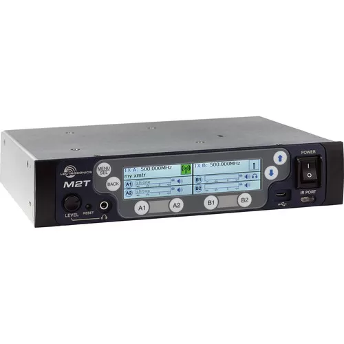 The M2T half-rack transmitter houses two stereo transmitters to provide two stereo audio channels, and for up to four mono audio channels in a single rack space. The audio inputs can be individually configured to be analog or Dante compatible. The analog input connectors are full-size XLR/TRS combo types for balanced line-level analog signals while the input preamp circuits use a special balanced amplifier with very high common mode rejection to minimize hum and noise. A Dante™ Ultimo™ interface via dual RJ45 connectors accepts Dante networked audio inputs and can daisy chain the digital stream to additional units via CAT6 cables. An additional RJ45 jack provides an Ethernet connection for programming and control via Wireless Designer™ software and a USB jack on the front panel allows for firmware updates. The transmitter features a full color, backlit LCD for high visibility in any environment, while the chassis is all-metal and can be racked singly or in pairs using included rack mount hardware.