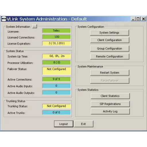 The RTS VLink Virtual Matrix system is the latest software release in a long history of leading edge technologies. The basic system can be operated in stand alone mode, the advanced version can integrate to your existing RTS intercom system via trunking, The system is easily expandible in group of 2 or 8 licenses to allow for future growth. For a FREE 30 day 2 seat trail version of VLink simply download the VLink Virtual Matrix software below.