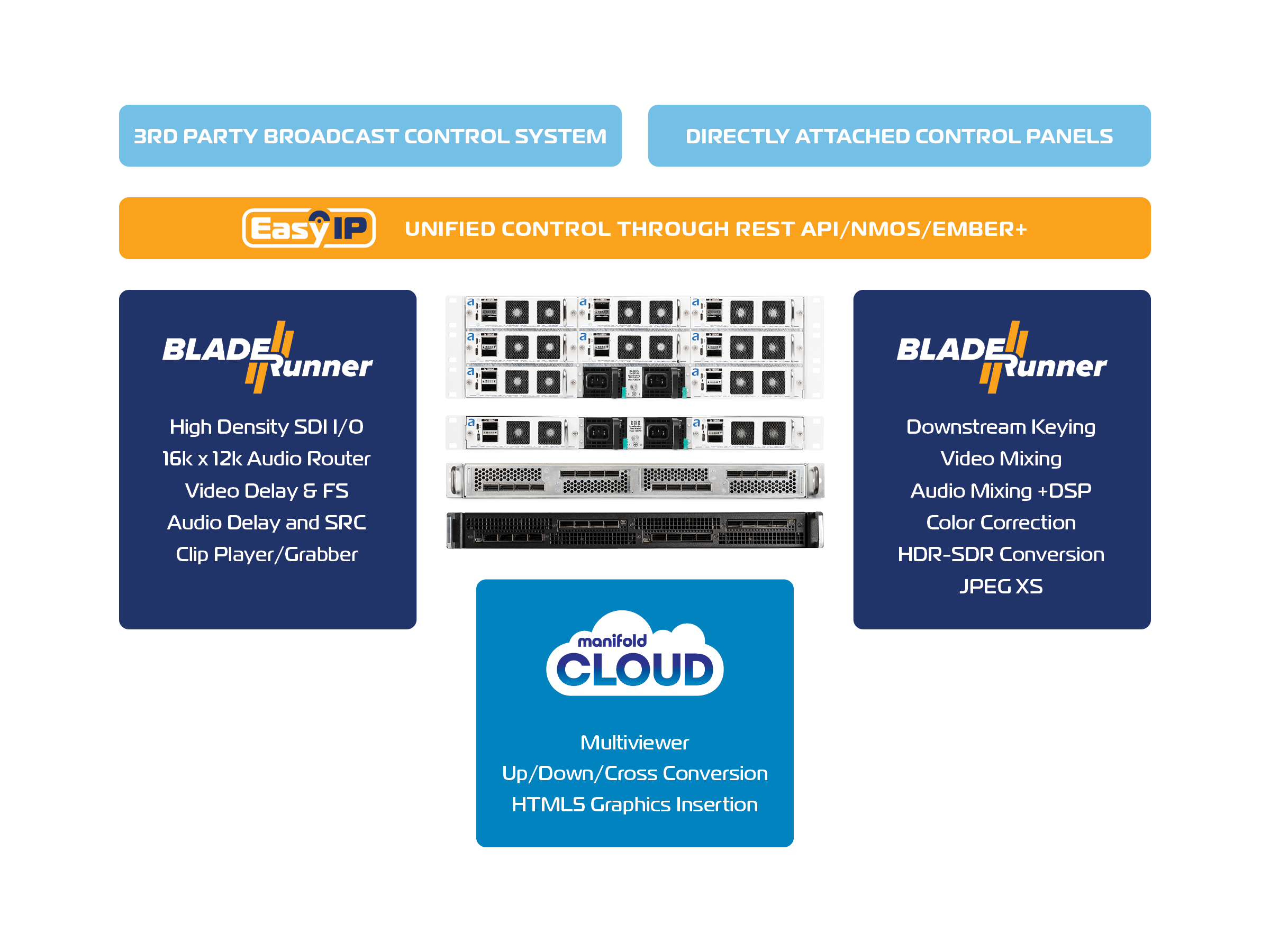 EASY-IP is a comprehensive package that integrates BLADE//runner and manifold CLOUD hardware and software, delivering a unified solution for video and audio routing, multiviewing, and processing. This tested and certified design by arkona and manifold ensures a smooth transition to a flexible, future-proof IP infrastructure.